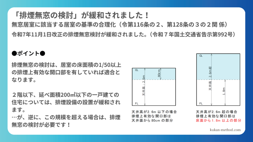 令和7年11月の施行令改正で緩和になった排煙無窓検討。