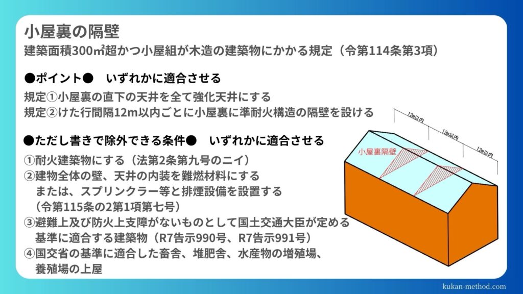 【今日のつぶやき】2026/01/13 2026年1月13日 最終更新日時 : 2026年1月13日 tomoyo tanaka <小屋裏隔壁について> 建築面積が300㎡を超え、かつ小屋組みが木造の建築物にかかる規定 中大規模木造にかかります。見逃しがちなのでご注意を! FacebookX